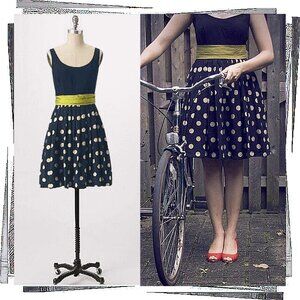 Vintage 2005 very dark navy (almost looks black in many types of light) dress with cream/beige polka dots, lime green sash and pink contrasting lining. It's Called "Slice of Lime" by Corey Lynn Calter. I wore this several times and it's in great condition