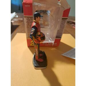 Vintage 2005 Trevco Jeff Gordon #24 NASCAR collectible Christmas holiday tree ornament. Features Jeff Gordon in his DuPont racing suit, holding helmet with cap on, standing on a 2005 display with number 24 and NASCAR. Approximately 4–4.5 inches tall. Missing top hanger so works as a shelf sitter. Original box is torn and damaged.