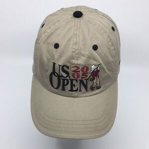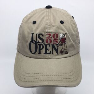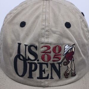 U.S. Open 2005 Pinehurst #2 tan cotton baseball cap hat. Still has original stickers on this one! Not listing as “new”, because this wasn’t my hat previously, but looks like the only wear is from storage and age. Velcro adjustable backstrap.
