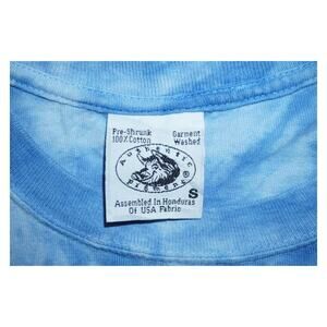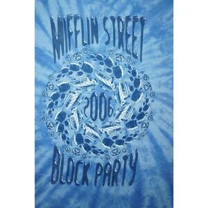 Rare vintage 2006 Mifflin Street Block Party t-shirt in a striking blue tie-dye pattern. Features a bold spiral design with police car and barrel graphics surrounding the event year. Reads “Mifflin Street Block Party 2006” on the front. Made by Authentic Pigment, tagged size Small, 100% pre-shrunk cotton, assembled in Honduras from USA fabric. Soft, broken-in feel with no holes or stains. A nostalgic Y2K-era tee from a notorious college party tradition — perfect for collectors, ravers, or vintage lovers.