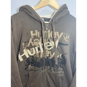 Rare vintage 2007 Hurley Sherpa-Lined Zip-Up Hoodie in rich brown with bold distressed Hurley graphic print.