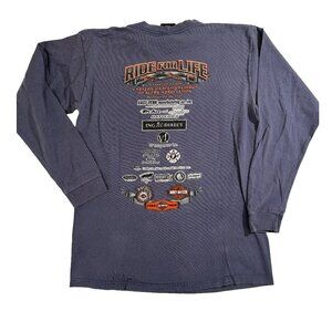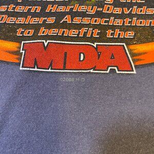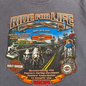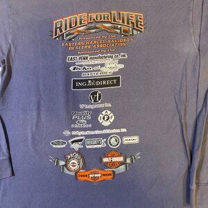 Rare 2008 Harley-Davidson "Ride For Life" long sleeve t-shirt. Gray color with bold front and back graphics featuring motorcycles, riders, and fundraising details. Classic biker style, soft cotton, single stitch hems. Made for Eastern Harley-Davidson Dealers Association to benefit MDA. Pre-owned, good condition.