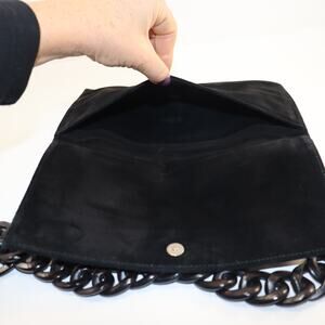 Authentic Gucci black suede shoulder bag featuring a chunky dark wooden chain strap and magnetic snap closure. Soft suede exterior with one main interior compartment plus a front slip pocket under the flap. A sleek, structured silhouette that’s both modern and timeless.