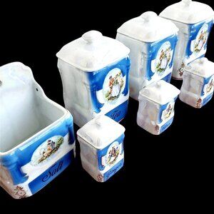 Very good condition: --no cracks or hairlines--but NOTE: missing wood lid for salt box, bottom of each canister has cement (?) on it, some flea bites in glaze, some surface scratching, Tea canister has tiny chip on top edge, one small lid has several very tiny chips on rim. But lovely!