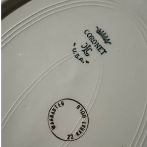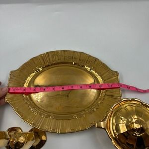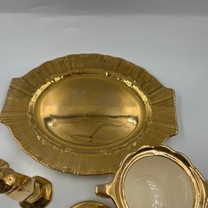 Coronet vintage 5 piece set of warranted 22 karat gold plated serving pieces, large etched tray, serving dish with lid and salt and pepper shakers. Set is in very good condition as pictured.