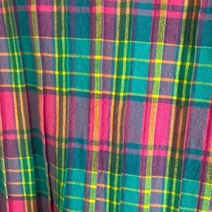 Vibrant plaid shirt with a mix of pink, blue, and green. Perfect for casual wear. In excellent condition and is not lined. Smoke free clean home. All reasonable offers are accepted. Has zipper in the back.