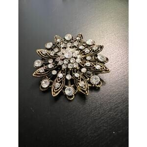 Vintage 2.25" Gold/Black Metal Flower Brooch with Round Crystals