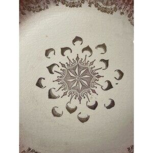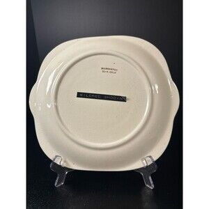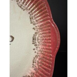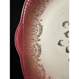 Beautiful vintage square serving plate with pink-red edge and ornate 22K gold filigree. Features a central medallion design on ivory glaze.