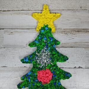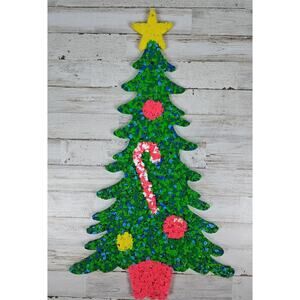 This vintage 23” Christmas tree melted plastic popcorn hanging wall decor is a unique and handmade piece perfect for adding a touch of nostalgia to your holiday decor. Made in the United States during the 1970s, this multicolored plastic ornament features a whimsical design that will surely stand out on your wall. With its unconventional look and retro charm, this piece is a perfect addition to any Christmas collection or a great gift for someone who appreciates vintage holiday decor.