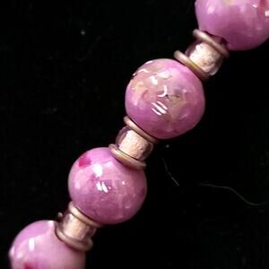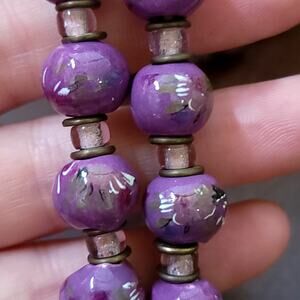 This vintage 1980s beaded necklace features hand-painted round beads in a striking shade of purple with delicate floral-inspired accents in white, black, and bronze. Each bead measures approximately 10 mm and is finished with a glossy glaze that enhances its rich color and subtle painted detailing. Small translucent spacer beads framed by antiqued metal rings provide contrast and rhythm to the design, adding depth and texture. Measuring 24 inches in total length, this necklace drapes elegantly at the chest, making it an ideal piece for layering with shorter chains or wearing as a standalone statement. The bold color palette reflects the vibrant, artistic jewelry styles popular during the late 20th century. Its handcrafted details and vintage character make it a truly unique accessory. In excellent vintage condition, this necklace is perfect for collectors, bohemian jewelry lovers, or anyone seeking a one-of-a-kind retro piece that adds both color and charm to any look.
