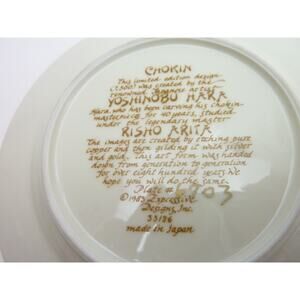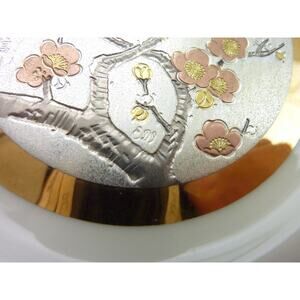 The Art of Chokin 24 Kt Gold Edged Silver Copper Porcelain plate. Beautiful work of a little bird sitting on a branch of a blooming cherry blossom tree.