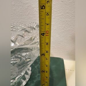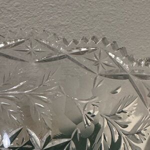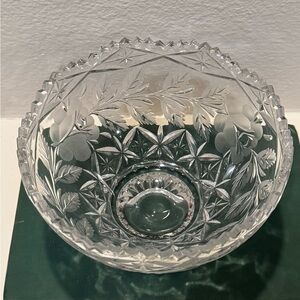 This is a stunning heavy crystal bowl by Lausitzer. The pattern is a deep cut flower and leaf design. The edge of the bowl is sawtooth. This lovely crystal bowl has a beautiful ring when it is tapped. This bowl would be an excellent centerpiece, elegant serving bowl, or a great addition to a crystal collection.