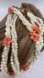 Stunning cream, vintage shell beaded necklace with the coral shells placed in between sections. Length of the necklace is 24”. The clasp to open one unhooks and extends outward to expose the long, secure hook from the oval clasp. Pinch hook and insert back into the oval clasp to lock into place. Only one is stock. Not marked. Excellent preowned condition.