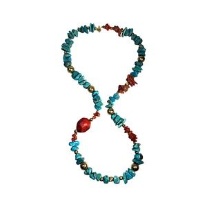 Vintage 26” Red Coral & Turquoise Nugget Necklace with Brass Beads Southwestern