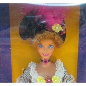 In Box - Barbie doll wearing French dress, hat, necklace, tights, boots, labeled doll stand and brush.