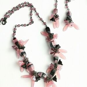 Necklace and earring set in hand made pressed and fire polished glass beads in heather pink and black