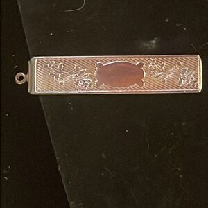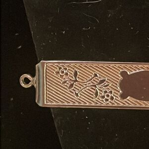Vintage 2” x 0.25” engravable gold tone with raised diagonal gold stripes, a floral design on both ends and a center engravable area tie clip/clasp/bar.