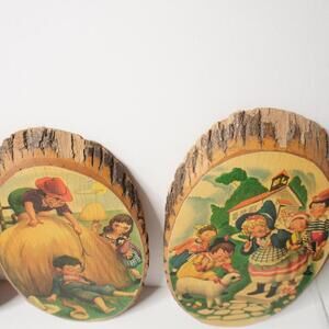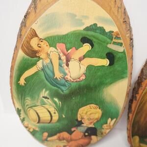 Vintage 3 Children's Nursery Rhymes on Wood Plaques with Tree Bark Wall Art VTG