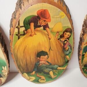 Vintage 3 Children's Nursery Rhymes on Wood Plaques with Tree Bark Wall Art VTG Mary Had a Little Lamb Jack and Jill Hill Little Boy Blue Retro Nostalgia Nostalgic Folk Art Americana Decor Log Cabin Grandma Core Kids Baby Room