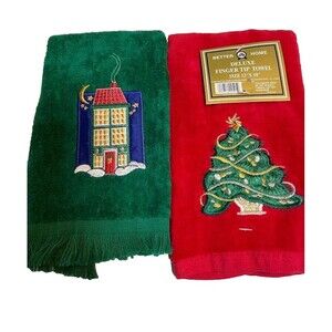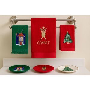 Add a festive touch to your bathroom with this vintage three-piece Christmas embroidered towel set. The set includes a red comet hand towel, two fingertip towels, and one NWT towel, all made of 100% cotton and machine washable for easy care. The soft and absorbent material is perfect for drying off after a shower or bath, and the embroidered details add a charming touch to your bathroom decor. The towels are rectangular in shape and come in various sizes, making them a versatile addition to any bathroom. They are perfect for use during the holiday season or throughout the year.