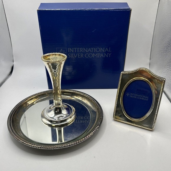 Vintage 3 PC Vanity Set Vase,Frame and Mirrored Tray International Silver Co.