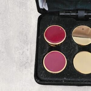 Add a touch of vintage glam to your collection with these stunning button links by Star Case. The gold tone and red/blue enamel adds a luxurious finish to these unique buttons, perfect for adding a pop of color to any outfit. The original vintage case adds to the charm of these buttons, making them a must-have for any collector or seamstress. The star shape and intricate design make these buttons a standout addition to any collection.
