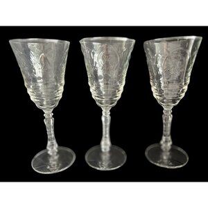 This 3 Pc Libbey Rock Sharpe NORMANDY Stem 3005 Cut Glass Wine Glass set features a vintage design from the 1940s with a mid-century modern style.