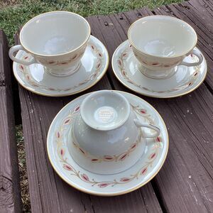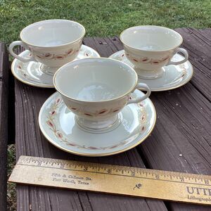 Elevate your tea time with this trio of vintage Knowles China tea cup and saucer sets. Each piece features a delicate Symphony Red pattern, showcasing a cream backdrop adorned with elegant gold trim and a stylized red leaf motif. The footed design of the cups adds a touch of sophistication, while the matching saucers complete the refined aesthetic. Perfect for a formal afternoon tea, a cozy breakfast nook, or as a cherished addition to a china collection.