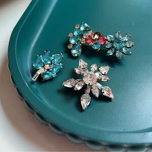 Vintage 3 Piece MCM 1950s 1960s Atomic Era Aqua Pink Crystal Brooch Pins Lot
