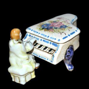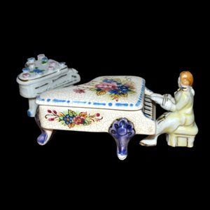 Vintage 3 piece floral piano set made in Japan. The larger piano is a trinket box.