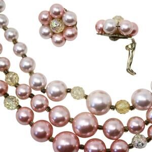 Vintage 3 Strand Pink Bead Necklace Clip On Earring Set in Original Box Japan