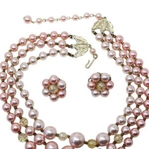 Vintage 3 Strand Pink Bead Necklace Clip On Earring Set in Original Box Japan