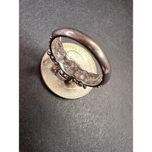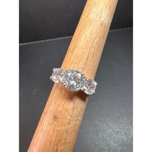 Three white / colorless cubic zirconia round cut gemstones prong set in an authentic 925 sterling silver setting that’s likely plated with platinum or rhodium. Accent stones on shank are also CZ. Measures a size 7. Past present and future design. 925 Thailand