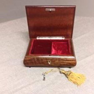 This is a beautiful Sorrento, handmade walnut burl wood, music jewelry box. It has an inlaid floral design in the lacquered walnut wood. This 30 note music box plays the song titled " Come Back To Sorrento". The inside is lined in red velvet fabric and comes with the original key to lock it. The dimensions are 6.5"w X 5"d X 2.5"h. It is in excellent condition. A Great Collectors Item.