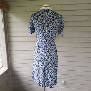 Vintage 1930's day dress. Silky material. Cute style. Yellowing at collar and pits. There is a tear in the fabric at the back of the left sleeve, which could be acceptably whipped stitched closed. Belt loops, but no belt. Vintage button front. Snap closure at side. Kick pleat at front and back of skirt. Darts on sleeves and at center back neck. In good vintage condition.