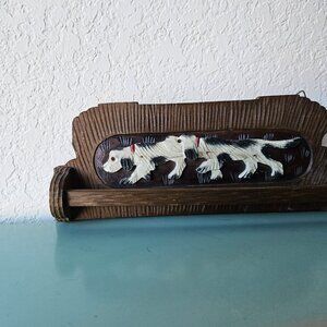 Vintage 30s Handmade Signed Hunting Dog Wooden Primitive Wall Hanging Tie Rack