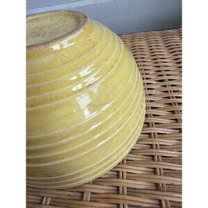 Charming vintage McCoy mixing bowl from the 1930s, featuring a yellow ribbed design. Perfect for farmhouse or primitive decor enthusiasts. Functional and decorative, ideal for baking or as a collectible piece. This is 7" in diameter and 4" deep. This has crazing and some stains in the crazing. No chips.This is in good vintage usable condition.