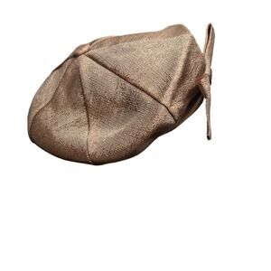 The hat's construction is characterized by a beret-like silhouette, slightly structured. The material appears to be a woven metallic thread or fabric, creating a textured surface that catches the light in a delicate manner.