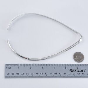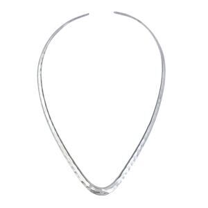 This bold vintage hammered sterling silver collar necklace offers a striking, sculptural design that sits gracefully on the neckline. The textured surface adds an artisanal touch, making it a versatile piece for formal or casual occasions. Its sturdy weight and elegant simplicity make it a timeless statement accessory.