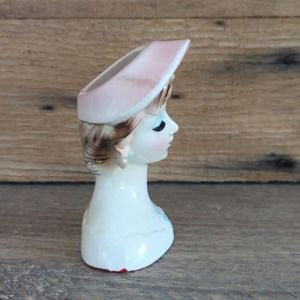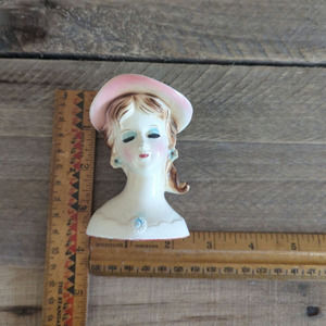 Vintage 3.5" Ceramic Lady Head Vase Once Red Dress and Hat Missing Earrings and Necklace.