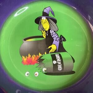 Serve up scares with this vintage 3D Halloween bowl, featuring a confused witch illustration surrounded by colorful eyeballs and playful Halloween stickers. Measuring 13.25″ across, this large plastic tray is perfect for candy buffets, party snacks, or haunted house decor.