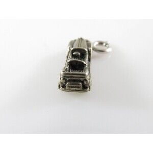 This vintage charm is a three-dimensional sterling silver representation of an antique convertible car. The specific make or model of the vehicle is not identifiable beyond its convertible design. It includes a c-clasp for easy attachment to charm bracelets or necklaces.