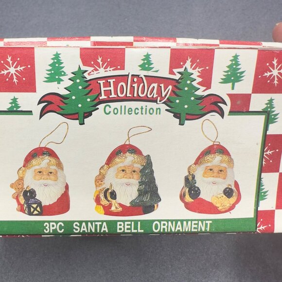 Vintage 3Pc Holiday Collection Santa Bell Ornaments Box Christmas Tree Lantern