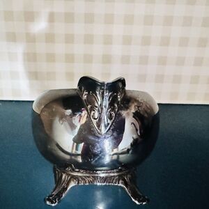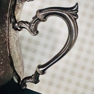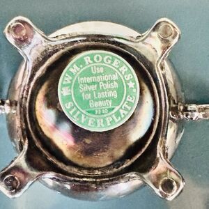Good vintage condition with light tarnish and surface wear typical of age. Some interior discoloration. Original green Wm. Rogers Silverplate label intact. Shines beautifully after a gentle polish.