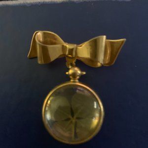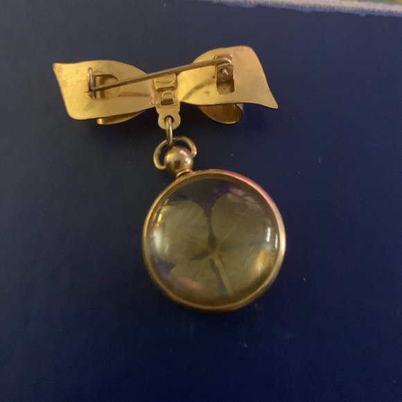 Vintage 4 Leaf Clover Brooch with clover encased in bubble locket. It has a pendant that is a round lucite ball that encases a real four leaf clover. It has a gold toned setting and the clover is a pale green. Pendant measures about 5/8" across.
