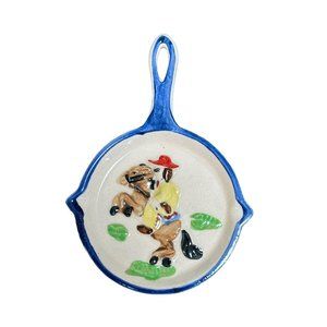 Vintage 4” Mini Ceramic Skillets Spoon Rest White Blue Horse Rider Handpainted