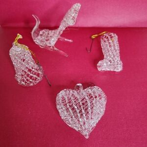 Vintage 4 Spun Glass Christmas Ornament Set. Heart, Sleigh, Stocking, Bell