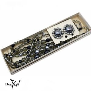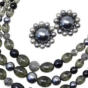 Vintage 4 Strand Silver Grey Bead Necklace ClipOn Earring Set Original Box Japan