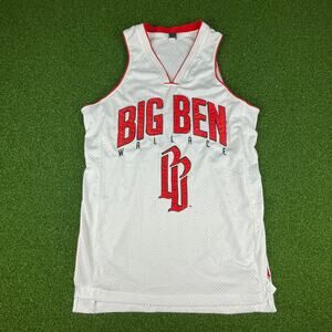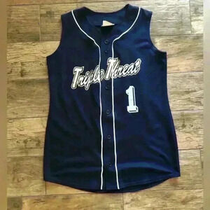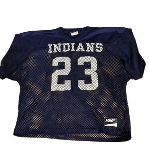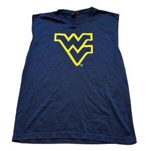 Stains front and back. Holes both arms. Armpits and collar discolored. Ripped seams along bottom. Color faded. Has pilling. Color bleed. USA made