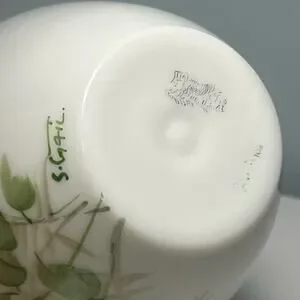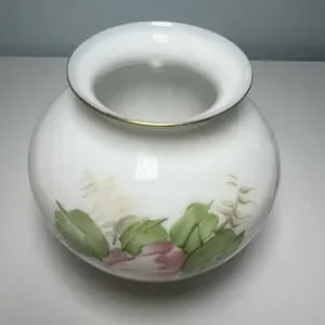 • Gold trim with pink hand painted flowers on a background of green leaves and ferns.